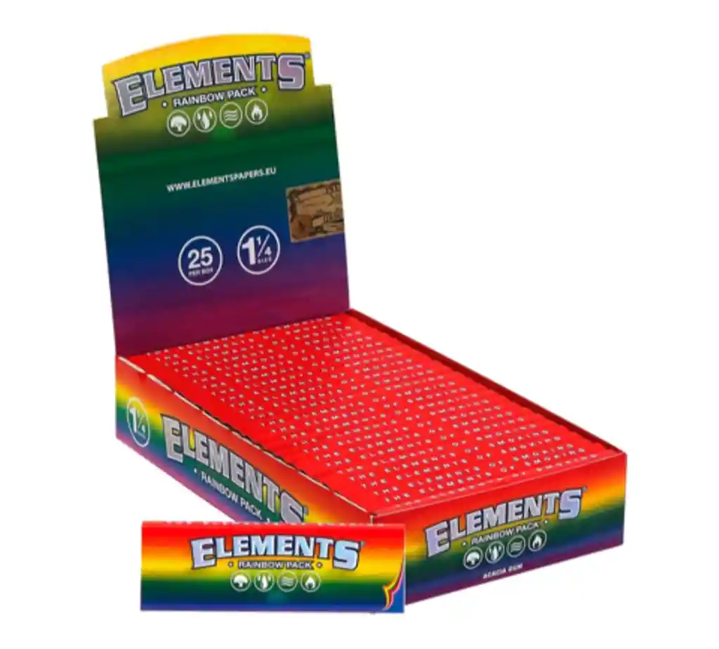 ¡Los papelillos Elements 1 1/4 ya están disponibles en todos los colores del arcoíris! Te gustan los papelillos de colores? acá tienes todos los colores del arcoíris en un solo librito, cada papel es de distinto color. Los papeles Elements queman suavemente y no producen ceniza, salvo el caramelo que se forma al quemar la goma de acacia, gracias a su impresión entrecruzada. Cada paquete contiene 25 hojas de puro placer. Diseño de la impresión: Marca de agua entrecruzada para una combustión constante y lenta. Goma de acacia Tamaño 1 1/4