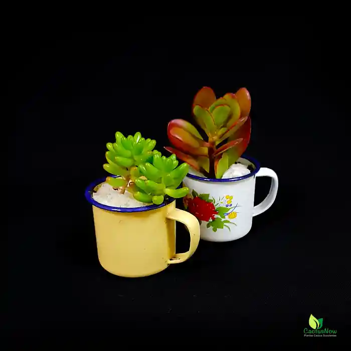Par de jarritos vintage con suculentas.