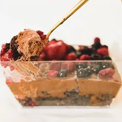 Producto congelado PARFAIT DE CHOCOLATE AMARGO CON BASE DE BROWNIE, SALSA DE BERRIES Y MANDARINA. 1.550 ML