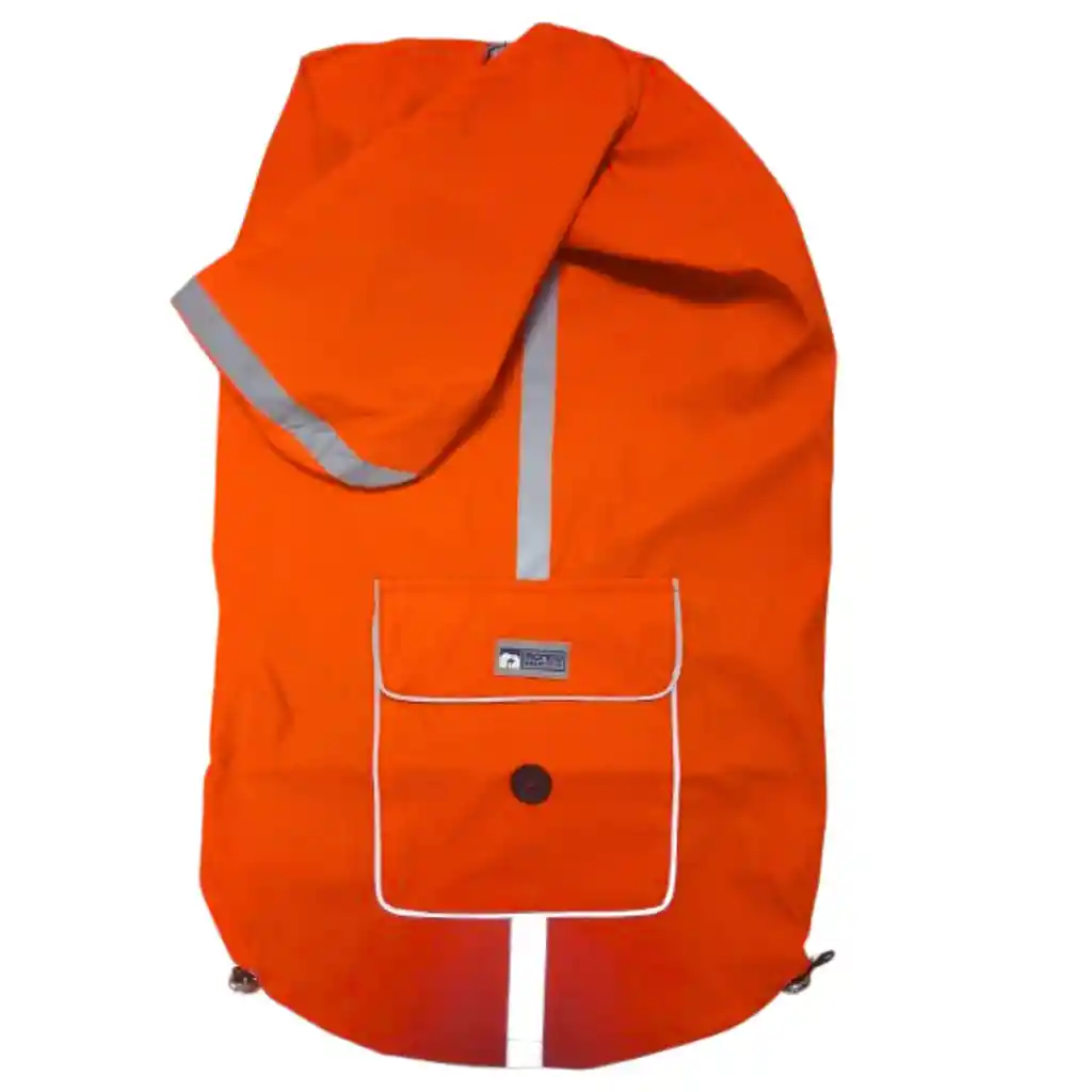 Parka Impermeable con capucha. Por la parte del cuello tiene un pequeño agujero para conectar el gancho de la correa de paseo. Con franjas reflectantes para un paseo seguro en las noches. Tiene un cómodo bolsillo acondicionado para las bolsas de desechos. Tala 5XL Largo: 65 cm; Pecho: 83-90 cm; Cuello: 54-58 cm Color: Rojo