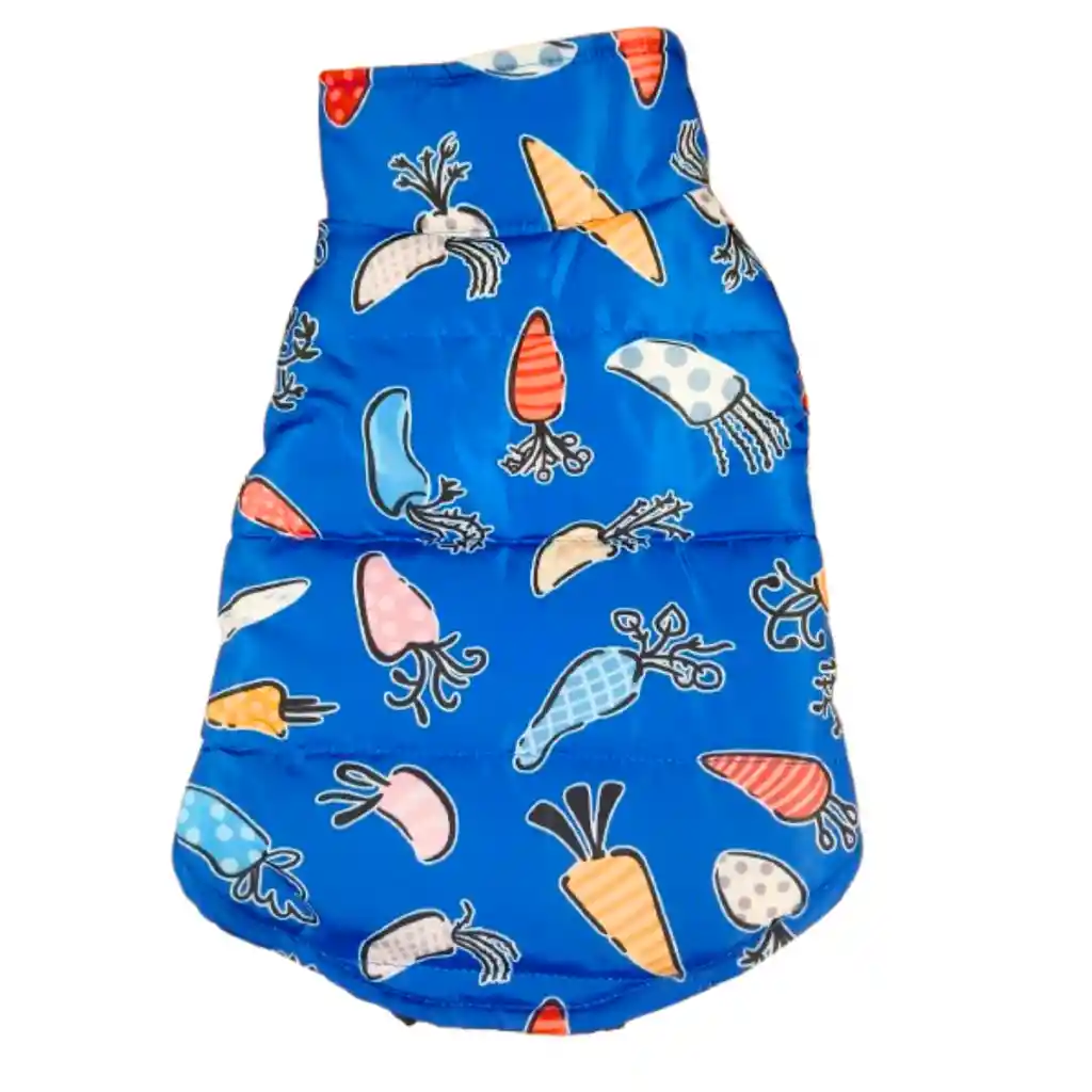 - Parka sin mangas con un moderno diseño de coloridas hortalizas. - Tiene cierre velcro en el pecho - En la parte trasera tiene ligas que se sujetan a las patas traseras para dar mejor firmeza. - Perfecto para el frio durante el invierno. Color: Azul Medidas Talla S: Largo: 25 cm Pecho: 34-38 cm Cuello: 20-24 cm