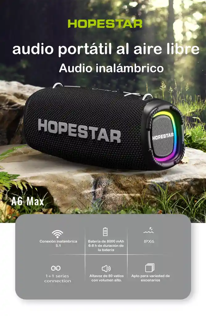 Descubre este parlante Bluetooth de 80W, diseñado para llevar la música al siguiente nivel. Con un subwoofer central de 50W y 2 tweeters, sentirás cada beat con claridad y potencia. Ajusta el sonido a tu estilo: Personaliza los bajos con su controlador integrado, ideal para cualquier ambiente o tus gustos únicos. Karaoke donde quieras: Incluye micrófono para compartir momentos inolvidables con amigos. Llévalo contigo: Su correa incorporada lo hace súper práctico para colgar y llevarlo cómodamente a todas partes. Batería de larga duración: Con 8.000 mAh, disfruta de 6 a 8 horas de música continua, ¡dependiendo del volumen! Características: Dimensiones: 38 cm x 14 cm x 16 cm. Conexión inalámbrica Función de memoria, reanudación del punto de interrupción Admite disco U/tarjeta Tf/modo de reproducción AUX Batería de iones de litio incorporada Admite decodificación de formato de música MP3 / WAV / WMA / FLAC / APE Al utilizar altavoces de alta fidelidad , el sonido es más natural y delicado. Nivel ipx6 impermeable Función CONEXIÓN DOBLE 1+1 Admite micrófono inalámbrico para conectar al altavoz Parámetros: Bluetooth: 5.1 Distancia de Transmisión: 10 Metros Potencia de Salida: 50W * 1 15W * 2 Tiempo de Juego: 6 a 8 Horas Efecto de Frecuencia: 40Hz~20KHz Altavoz: 119MM 4Ω 50W*1 78MM 4Ω 15W*2 Potencia de Entrada: 5V-2A Consumo Máximo de Corriente: 1A Tipo de Batería: LITIO 8000mAh Interfaz de entrada de señal de audio: Conector de auriculares estándar de 3,5 MM (ESTÉREO) La caja contiene: 1 cable USB tipo C 1 cable AUX 1 manual de usuario 1 micrófono 1 correa para transportar