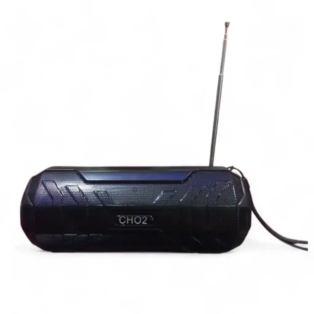 Parlante Bluetooth cilíndrico CH02 con múltiples modos: BT, USB, tarjeta TF y radio FM. Cuenta con antena retráctil y diseño compacto para un sonido envolvente.