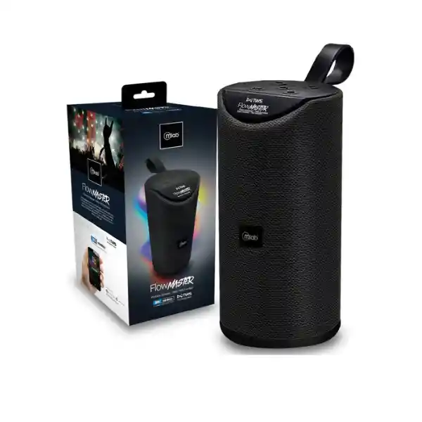 Parlante Flow Master con función TWS Funciones: · Reproducción de archivos MP3, directo desde los puertos USB /mSD · Conexión Wireless BT, hasta 10mts(*) de cobertura. · Conexión TWS, permite conexión de 2 parlantes iguales · Función manos libres · Radio FM Características: · Alimentación: USB DC5V. · Radio FM · Conexión Wireless BT · Función TWS · Slot: USB / micro SD · Freq. Resp.: 150Hz-18KHz · SNR: ≥ 80db. · Batería recargable