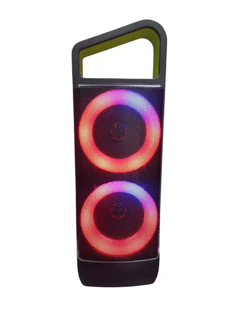 Disfruta de tu música con gran potencia y efectos de luces LED. Parlante portátil tipo torre, perfecto para fiestas y reuniones. Conexión Bluetooth, entrada auxiliar y diseño con asa para transportar fácilmente. Color Verde.