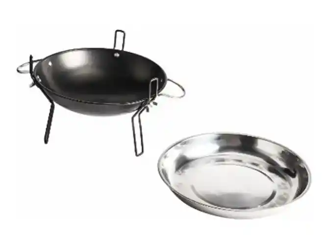 Brasero de sobremesa Mantén caliente tus comidas en la mesa con éste brasero de sobremesa. Cuenta con 2 piezas de acero al carbono y acero inoxidable. Diámetro de la pieza de acero al carbono: 25 cm Diámetro de la pieza de acero inoxidable: 27 cm Peso: 0.5 kg