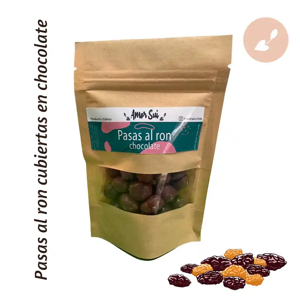 Deliciosas Pasas al ron cubiertas de chocolate de leche. Contiene 70g. Su envase es doypack con cierre, reutilizable. Ideal para acompañar con helados, postres y/o repostería.
