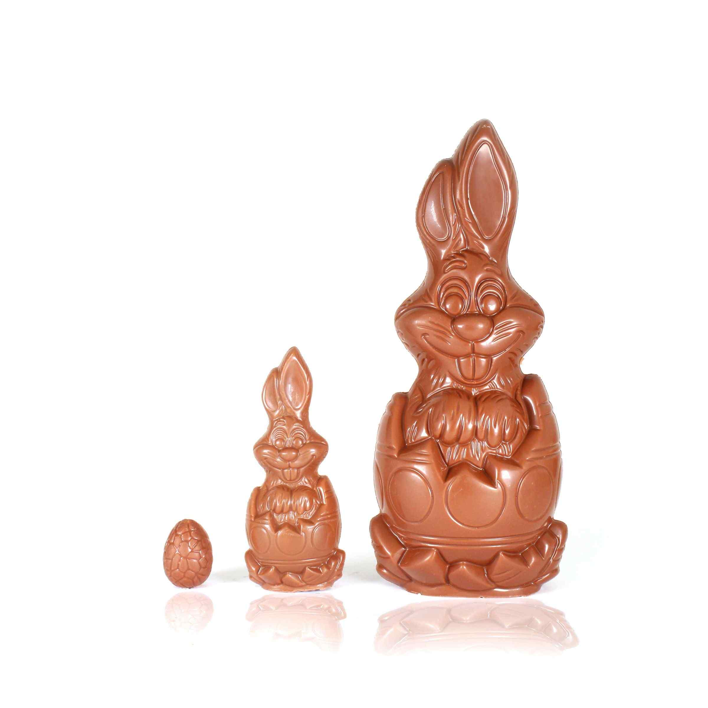 Hermoso conejo de Pascua de chocolate belga de leche 36%. Altura: 21cm. Stock limitado.