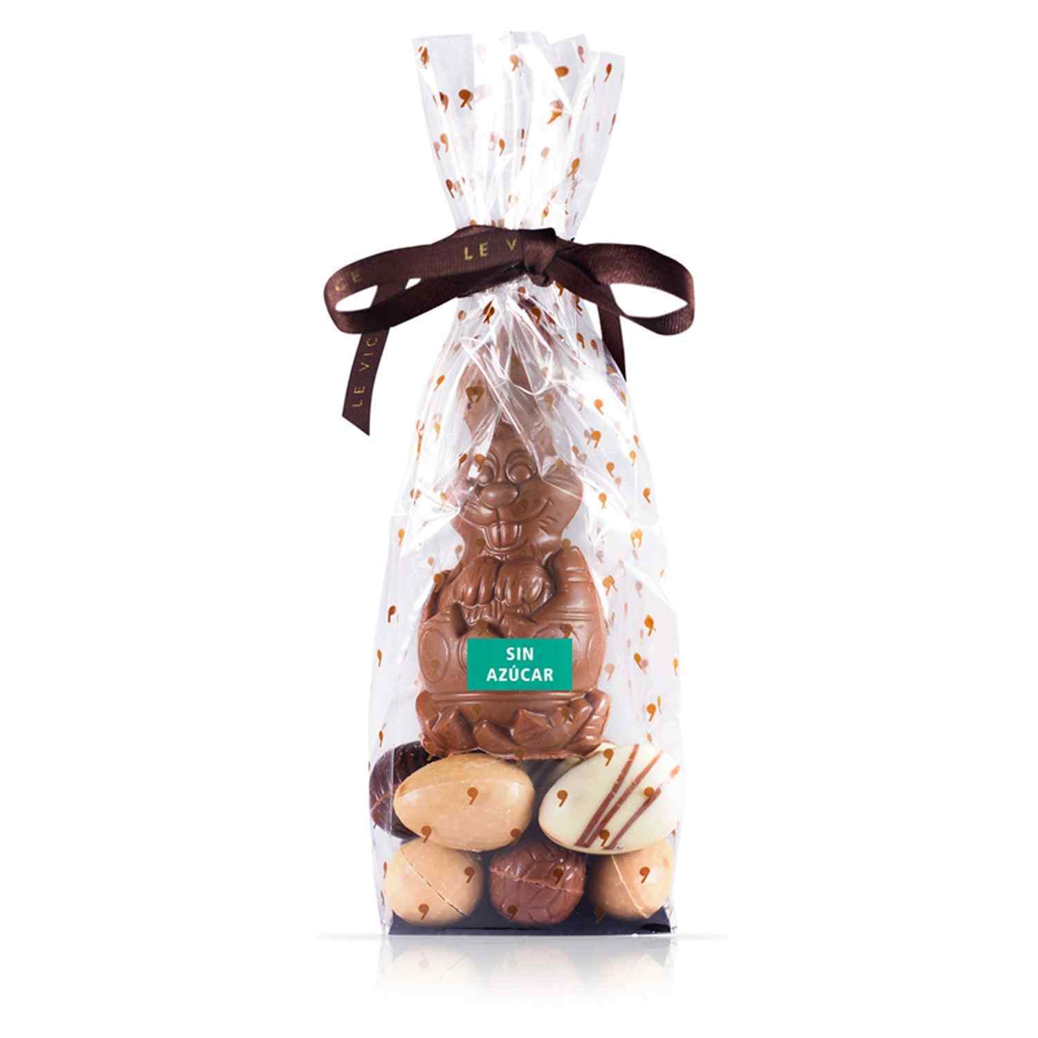 Deliciosos huevitos de chocolate Le Vice acompañados por un Conejo Macizo de Chocolate Leche. Todos los huevitos vienen surtidos aleatoriamente cubiertos en chocolate de leche sin azúcar 36% y negro sin azúcar 64%.