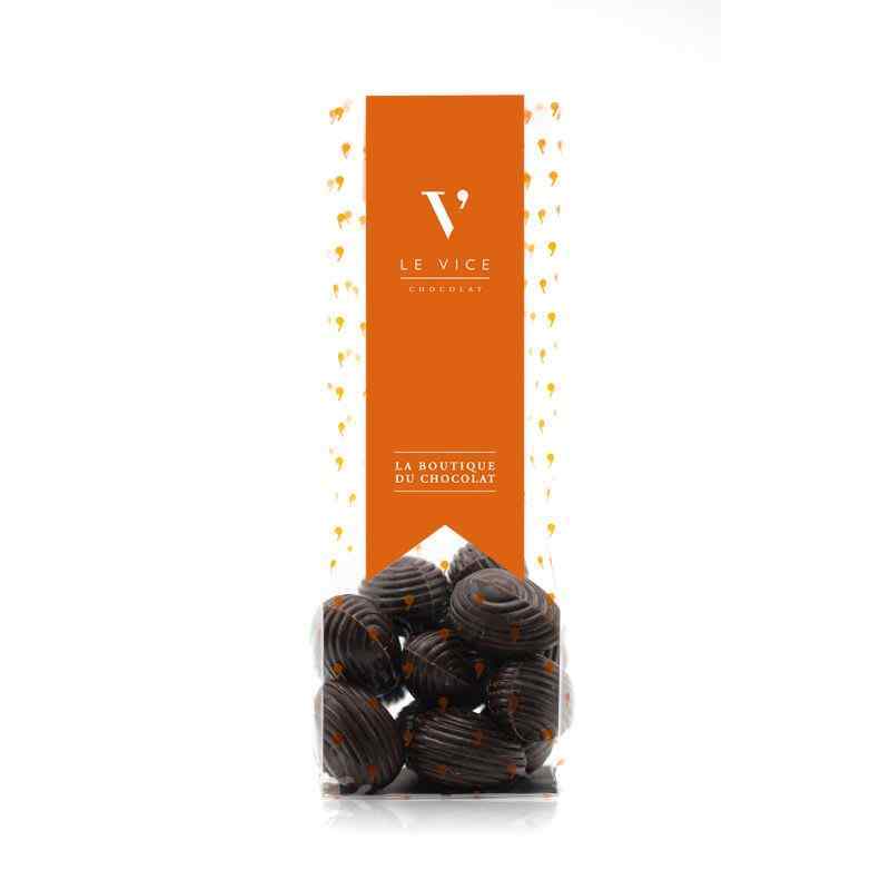 Huevitos rellenos en praliné de almendra y cubiertos en chocolate negro 64%.