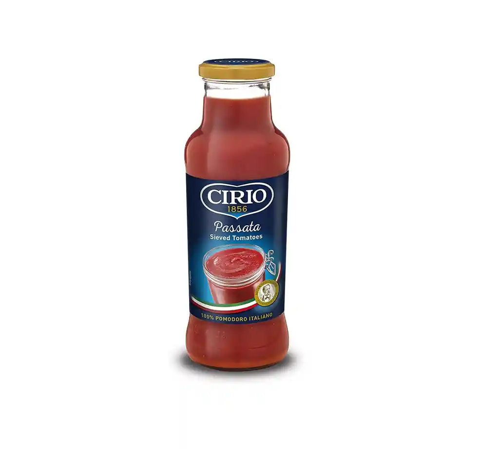 La experiencia y los conocimientos únicos de Cirio han dado como resultado la mejor Passata italiana. Tomates suaves y aterciopelados con un sabor dulce y delicado, nuestros tomates redondos son escaldados, pelados y pasados por un colador fino para producir una salsa de textura suave que realzará el sabor de sus platos. ¿POR QUÉ PASSATA? Ideal para sopas cremosas o salsas de tomate, solo agregue hierbas y especias INGREDIENTES Tomates, sal, corrector de acidez: ácido cítrico