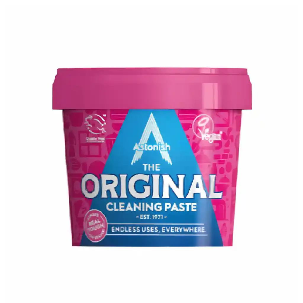 Pasta de Limpieza The Original 500grs. Descubre la eficacia de nuestra Pasta de Limpieza Original Astonish, formulada para eliminar suciedad, grasa y mugre con facilidad. Esta pasta transforma y revitaliza tus objetos, dejandolos como nuevos sin necesidad de productos quimicos agresivos. Gracias a su formula suave, no es necesario usar guantes, ofreciendo una experiencia de limpieza segura y comoda. ¡No es un milagro, es Astonish!. Nuestro producto es verdaderamente versatil, con usos infinitos en todo el hogar. Desde unidades de ducha y esmalte hasta extractores, herramientas de jardin, grifos, juntas, puertas, vidrio, plastico, acero, estufas de leña, zapatillas y residuos de jabon, esta pasta es tu aliada perfecta para cualquier tarea de limpieza. Su capacidad multiusos la convierte en una opcion indispensable para mantener tu hogar impecable. Ademas, la Pasta de Limpieza Original Astonish es totalmente reciclable y viene con una fragancia frutal refrescante que deja un aroma agradable en tu hogar. Su distintiva pasta rosa no solo garantiza una limpieza profunda, sino que tambien cuida del medio ambiente. Confia en Astonish para lograr una limpieza efectiva y ecologica, sin esfuerzo