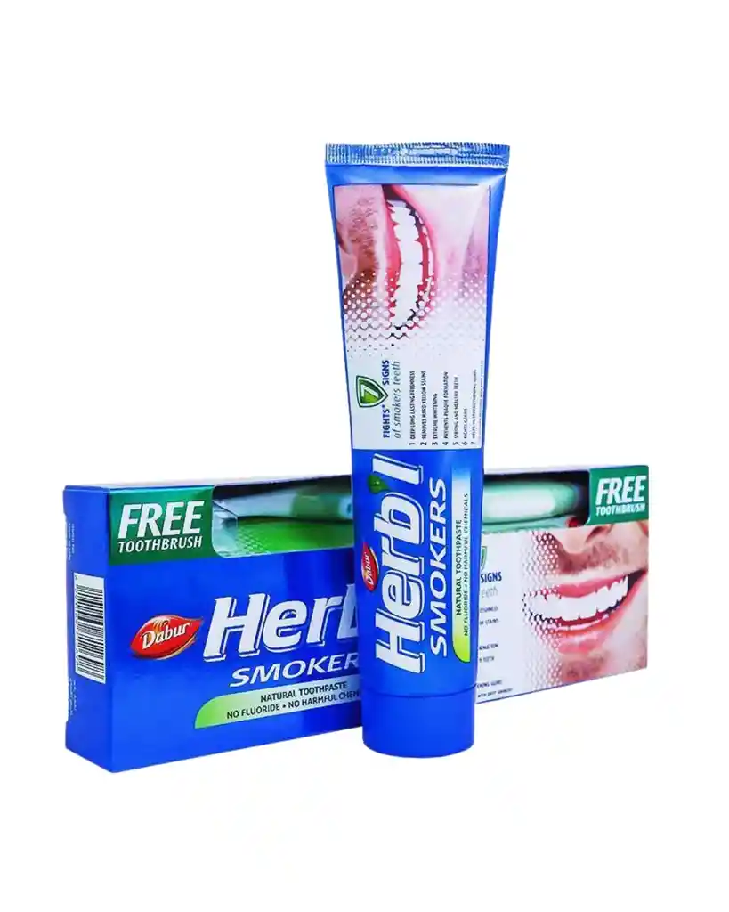 Pasta de Dientes Dabur Herbal Smokers (Fumadores) La crema dental Dabur Herbal Smokers ayuda a eliminar las manchas de nicotina y garantiza una frescura duradera mediante el uso de ingredientes naturales como la sal, la corteza de mora y la menta. También ayuda a proporcionar soluciones para combatir los 7 signos de los dientes que se ven afectados por fumar. 1.Ayuda a combatir las manchas de nicotina que ocasionan el sarro color amarillo. 2.Previene la formación de placa. 3.Combate gérmenes que causan las caries. 4.Ayuda en el fortalecimiento de las encías. 5.Aliento fresco profundo y duradero. 6.Blanqueamiento extremo.