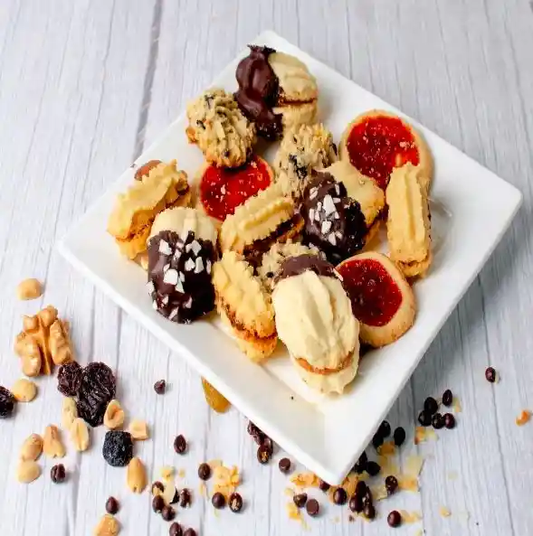 Galletas surtidas con chocolate, manjar, frutos secos y mermelada de frambuesa