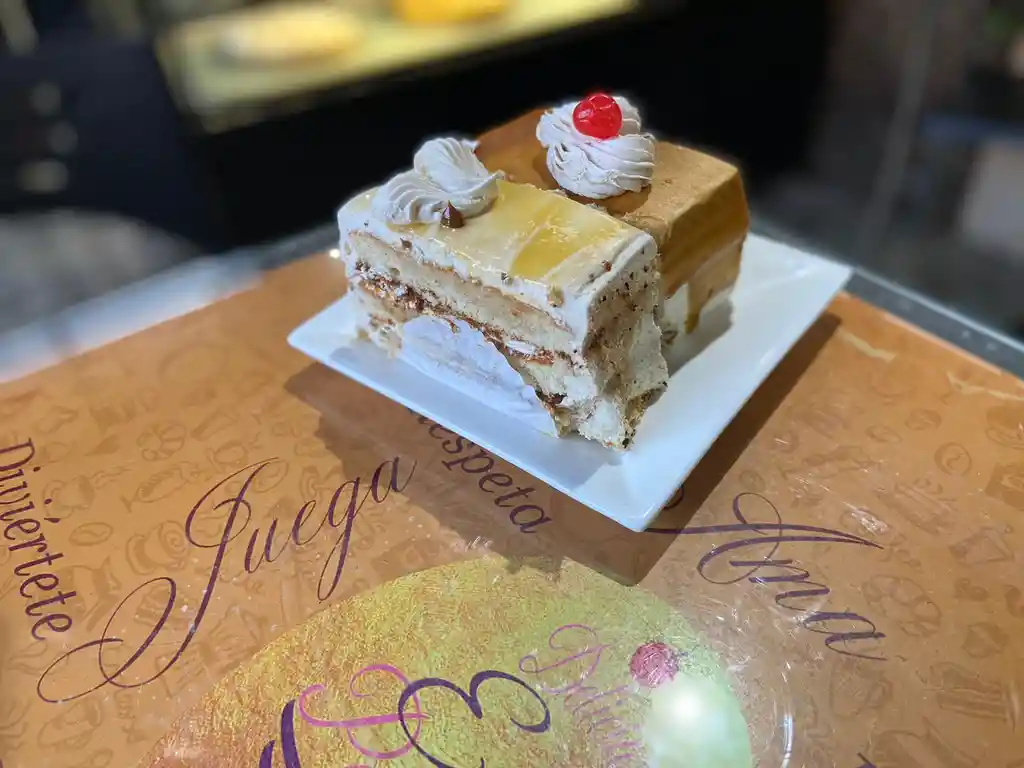Pastel Biscocho lucuma, manjar y crema chantilly