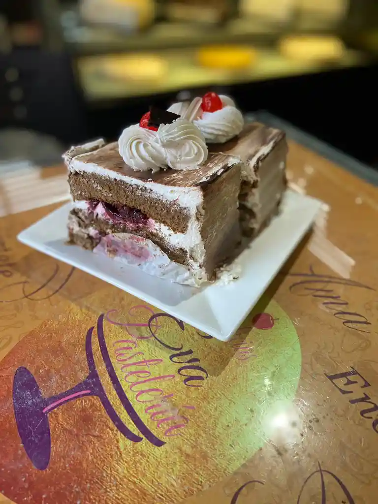 Pastel en biscocho de chocolate relleno con guinda acida y chantilly