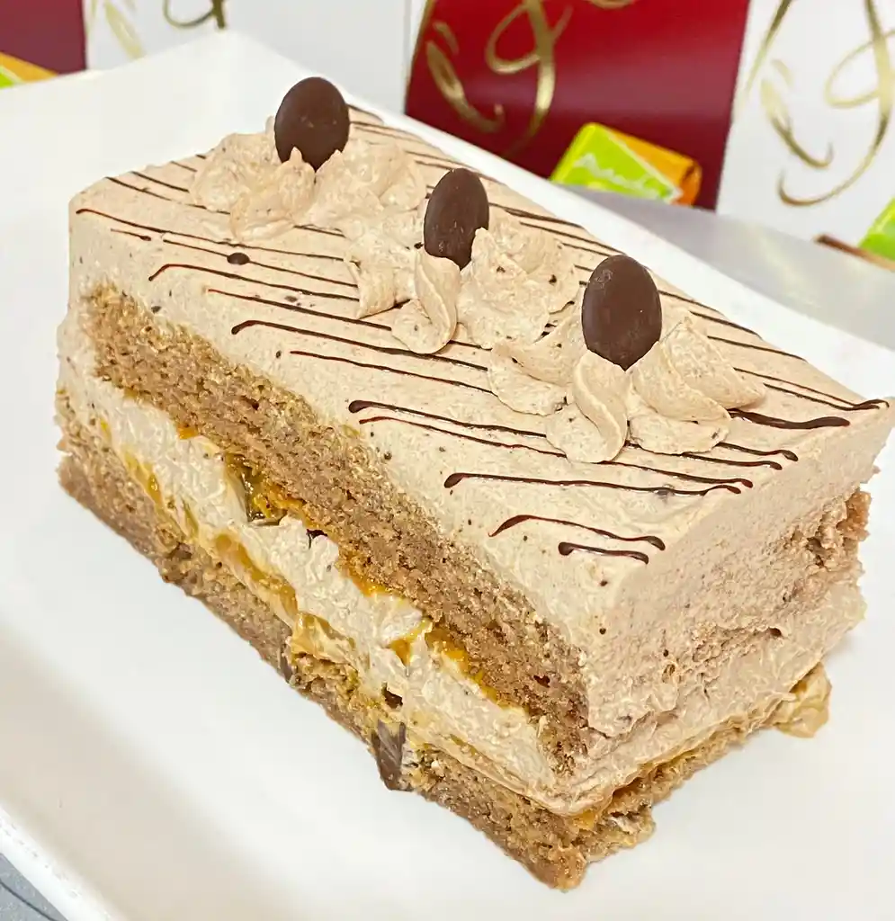 BIZCOCHO DE CHOCOLATE, MANJAR, TROZOS DE CHOCOLATE Y CREMA DE CHOCOLATE