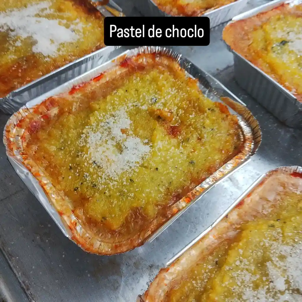 El pastel de choclo es uno de los platos más emblemáticos y queridos de la gastronomía chilena. Es un plato que combina de forma única los sabores dulces y salados, ideal para quienes buscan una comida contundente y llena de tradición Tiene una base de pino, huevo duro, aceitunas y pollo cocido, todo cubierto con pastelera, hecha de choclo y albahaca molidos, y azucar encima. El pastel tiene una horneada pero se entrega frio exccepto los dias viernes por el momento.