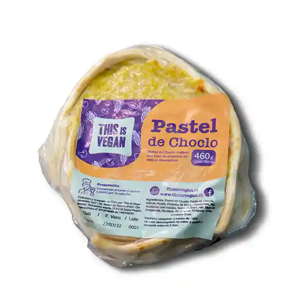 Pastel de Choclo This is Vegan 460gr. A base de pino de cebolla, soya, champiñón y acompañada de pastelera dulce.