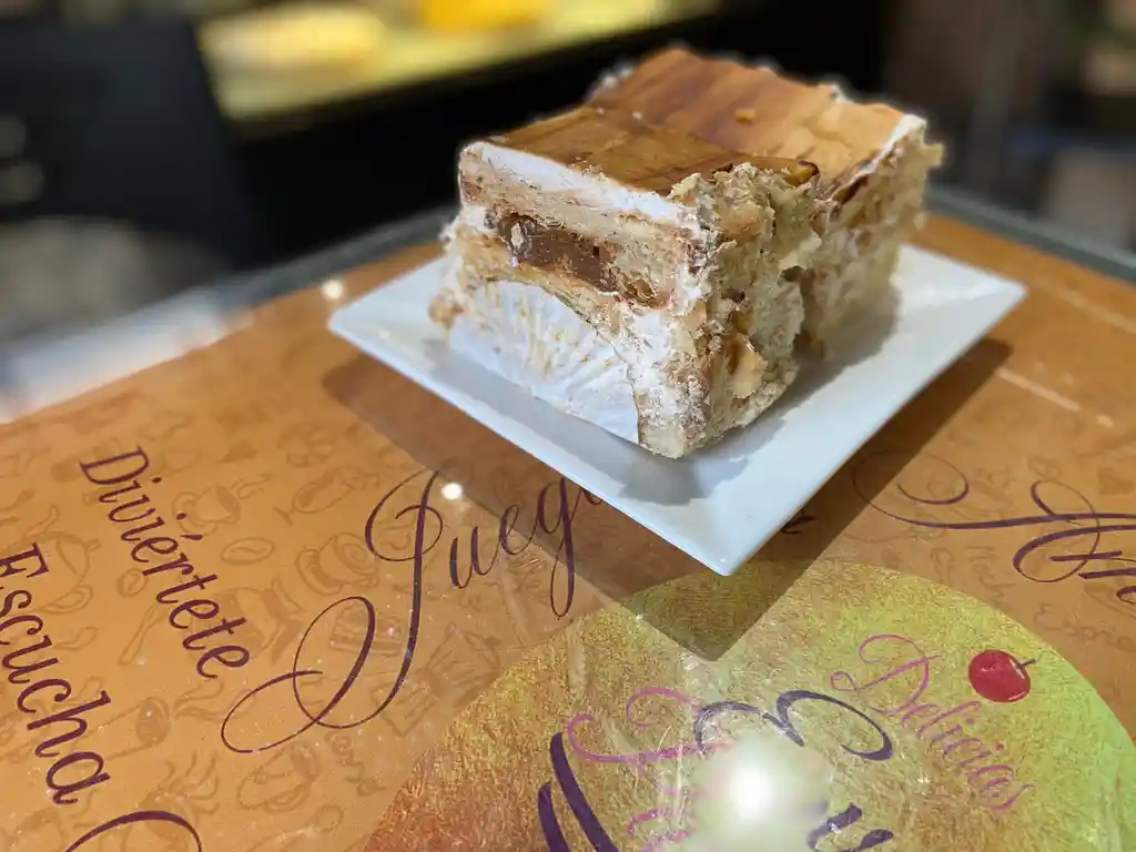 Delicada masa mil hoja rellena de lucuma, manjar y crema chantilly