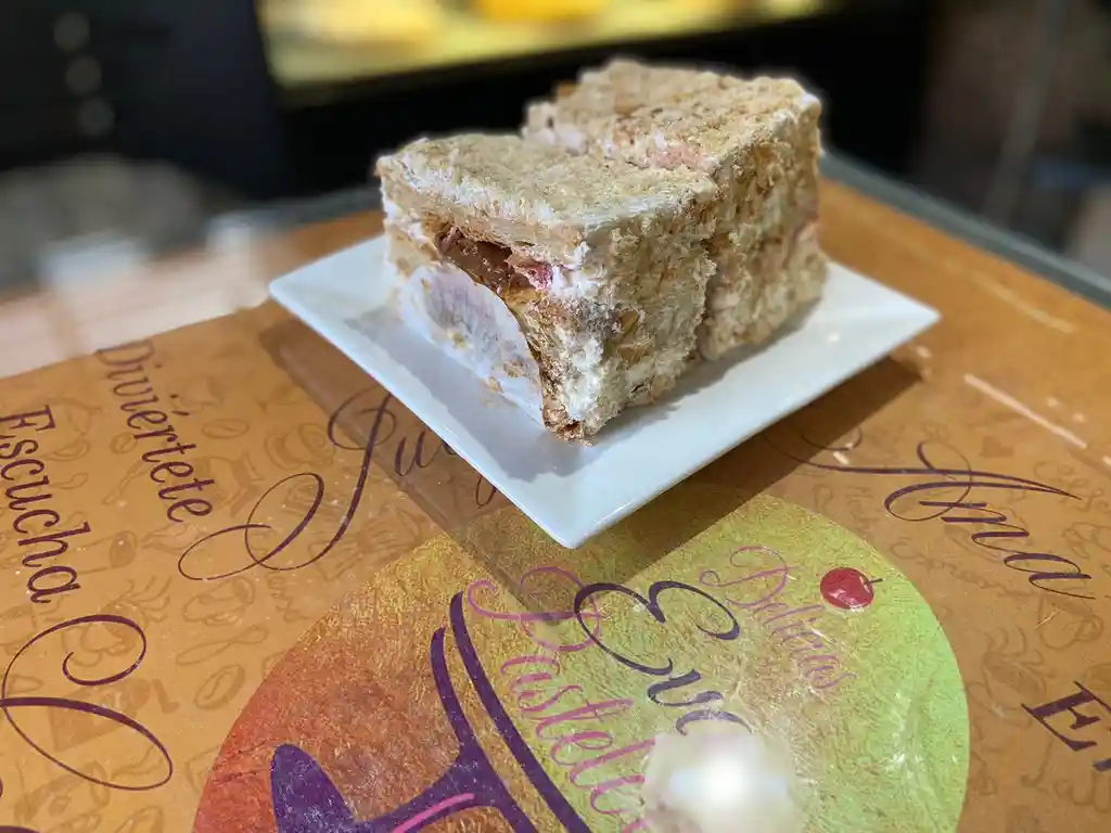 Delicada masa mil hoja rellena con majar, frambueza y crema chantilly