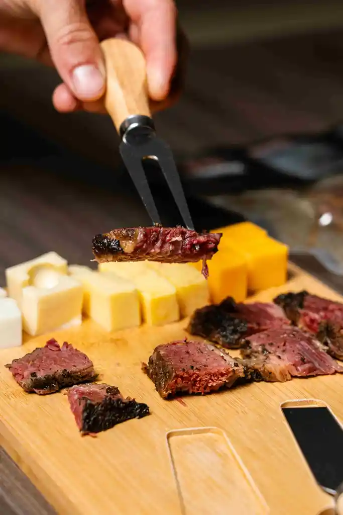 Tapapecho de Vacuno Angus sometido a proceso de Salmuera Ahumado Nuestro pastrami comienza con un meticuloso proceso de curado en salmuera durante una semana que realza cada fibra de sabor. Luego, es ahumado lentamente durante 12 horas con mix de especias, una mezcla equilibrada de maderas nobles: Roble para profundidad y Cerezo para un toque dulce y aromático. El resultado es una pieza de carne tierna y con un perfil de sabor complejo, perfecto para sándwiches, tablas o disfrutar solo.