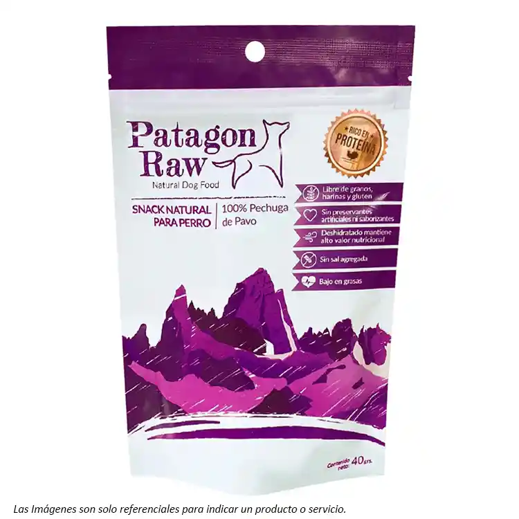 Snack Patagon Raw para Perros de todas las Razas, directo de la Patagonia Chilena. Monoproteico, elaborado solo con Carne fresca 100% Deshidratada. Sin preservantes artificiales. Libres de granos, harinas y otro carbohidratos de baja calidad abultantes.