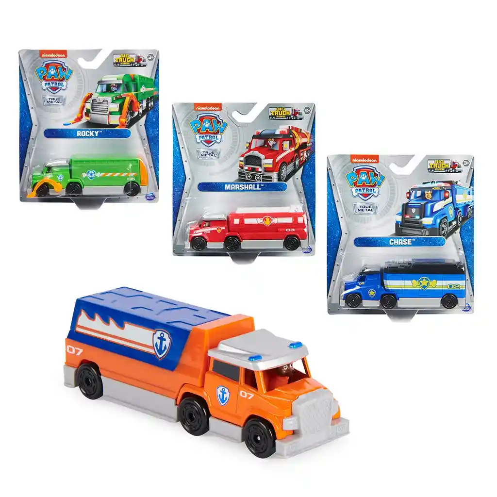 Vehículos metálicos Paw Patrol Big Truck Pups ¡Sal al rescate junto a los cachorros de Paw Patrol y crea tus propias y emocionantes misiones! Inspirados en la versión Big Truck Pups, estos vehículos de metal son a escala 1:55. Tienen detalles y gráficos auténticos con ruedas que giran de verdad.