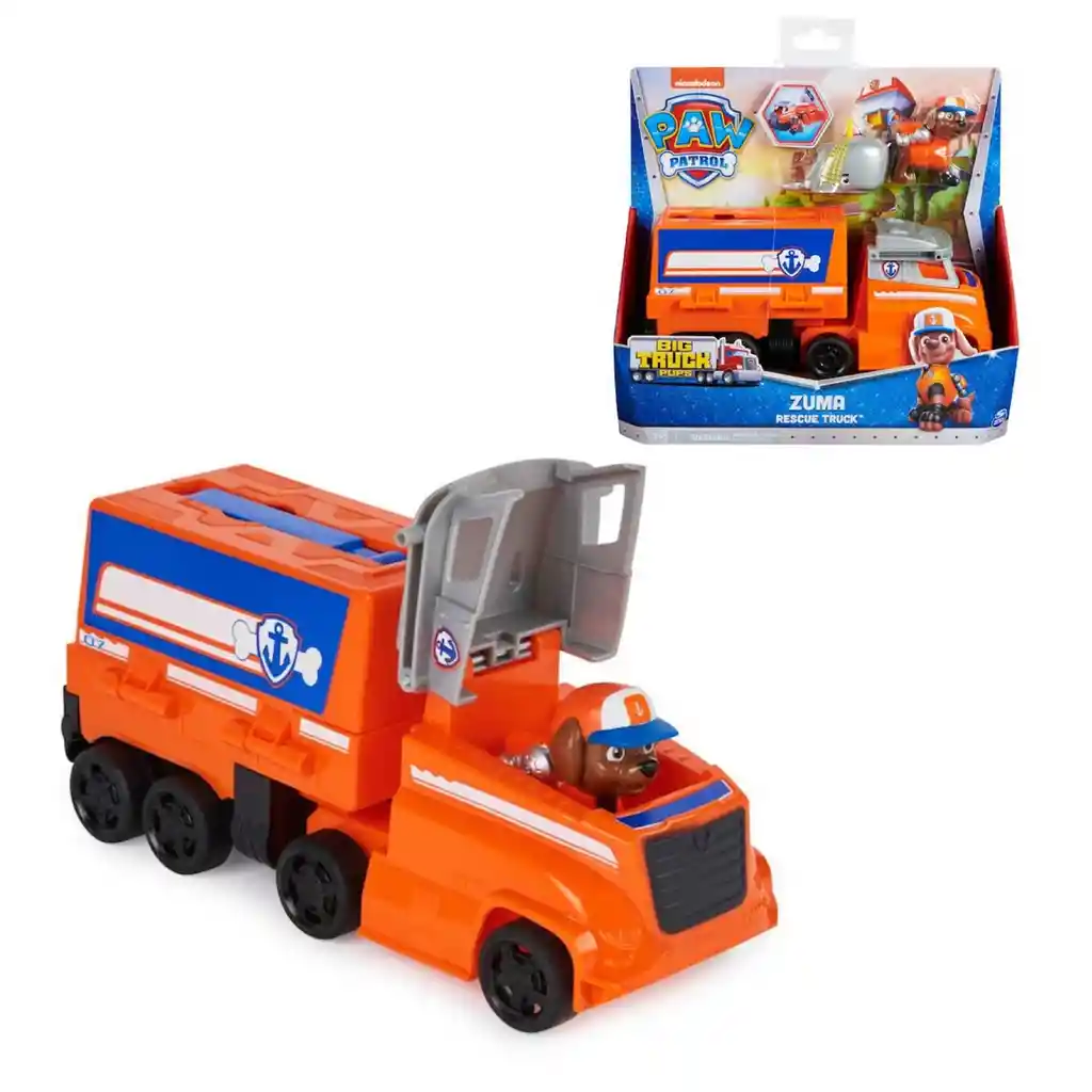 Camión transformable Big Truck, el camión de Zuma se transforma rápidamente en modo Centro de comando. Simplemente levante el techo de la cabina del camión para que Zuma entre y salga del asiento del conductor. Luego, abra el techo del cuerpo del remolque cisterna para transformar su camión en el modo de centro de comando y revele su tanque de rescate de animales y su grúa de rescate de emergencia. Cuando el tráiler esté en el modo Centro de mando, coloca a Zuma en los controles para activar la grúa de rescate y cargar a su amiga ballena en el tanque de rescate. Zuma luce su uniforme anaranjado Big Truck Pups, con sombrero de camionero y mochila.Incluye 1 camión Big Truck – Camión Cisterna Zuma, 1 figura Zuma, 1 ballena."