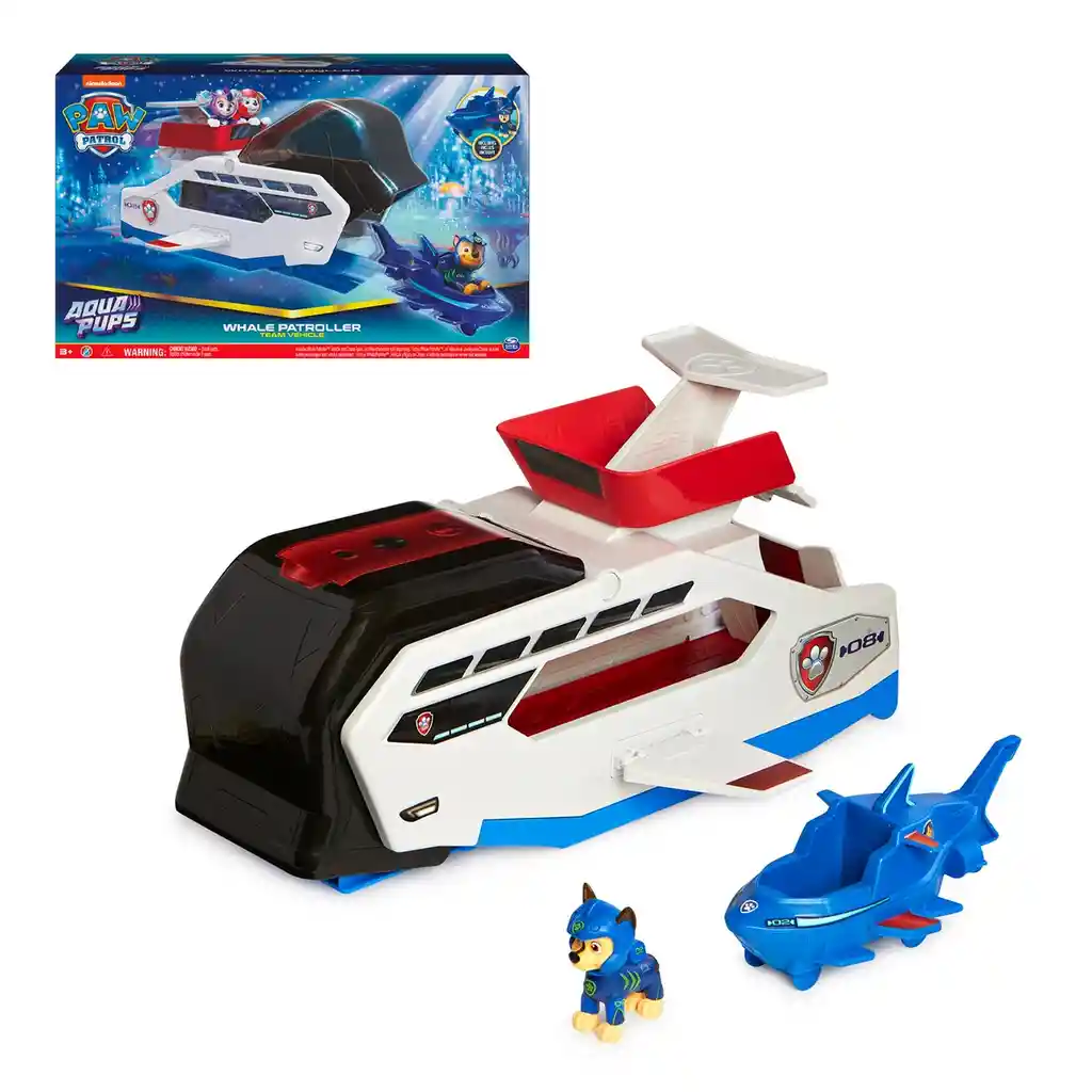 ¡Únete a Chase en una misión de rescate subacuático con el Patruller de ballena! Este vehículo de rescate de Paw Patrol es un lanzador con diseño de ballena. Incluye una figura exclusiva de Chase con su traje neopreno azul aqua pups, con detalles de escamas de peces y casco de buceo. ¡Prepárate para la acción! Coloca a Chase en el vehículo y lánzalo directo hacia la acción acompañándole a explorar las profundidades del océano. Con este vehículo patruller de ballena, los niños podrán divertirse recreando las aventuras de Chase y sus amigos, siendo también un elemento importante ya que desarrolla la imaginación y la creatividad, fomentando el juego de rol y promoviendo el aprendizaje sobre la amistad y el trabajo en equipo.
