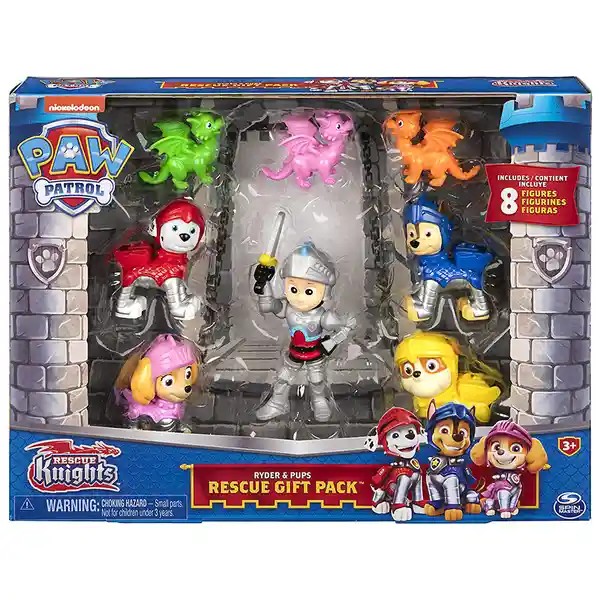 Set de Figuras Paw Patrol Contiene 8 Figuras. Prepárate Para Llevar a Cabo Misiones Medievales Llenas de Acción Con el Set Figuras Caballeros. Incluye Una Figura de Acción de Ryder Especial Que no Encontrarás en Ningún Otro Lugar Además de a Chase Marshall Rubble Skye y Tres Pequeños y Coloridos Dragones. Gracias a su Armadura de Caballeros Ryder y Los Cachorros Están Listos Para Saltar a la Acción y Ayudarte a Inventar Emocionantes Misiones en Las Que Tendrás Que Rescatar a Los Dragones al Igual Que en la Serie. Incluye: Ryder, 4 Cachorros y 3 Minidragones. Modelo Spin Master: 6062122 - Edad: 3 + Años