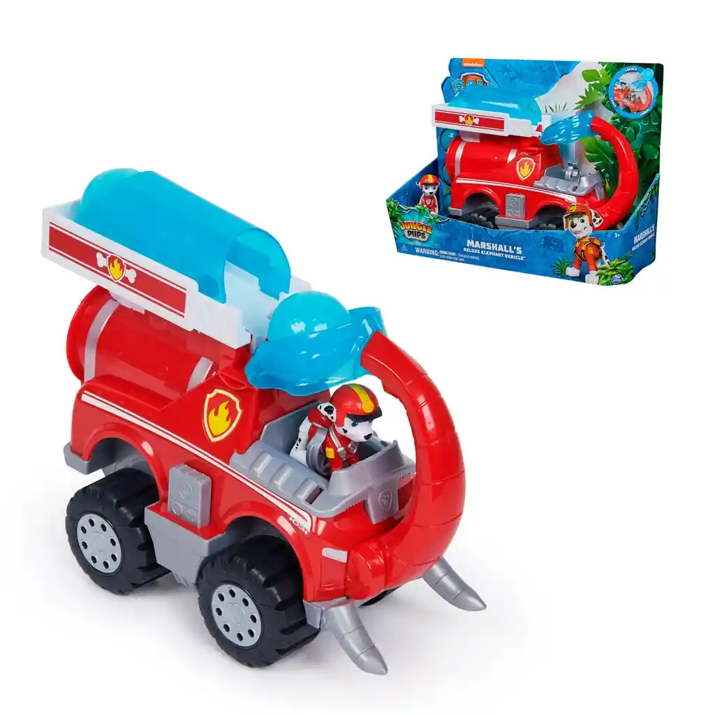 Camión de Bomberos Elefante, cuando llegue el momento de un emocionante rescate, coloca a Marshall en el asiento del conductor y corre hacia el rescate, usando los colmillos de elefante y las ruedas de gran tamaño para eliminar cualquier obstáculo. Lanza 3 proyectiles: abre el compartimento trasero para acceder a los 3 proyectiles de agua. ¡Cárgalos en el alimentador de proyectiles y vuelve a colocar el baúl en su posición, luego presiona el botón para lanzar! Marshall se ve igual que en la serie Paw Patrol, vestido con su traje rojo. ¡uniforme y casco de explorador de la jungla!