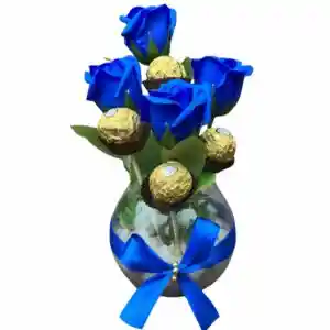 Pecera De 4 Rosas Azules Eternas Y 4 Bombones