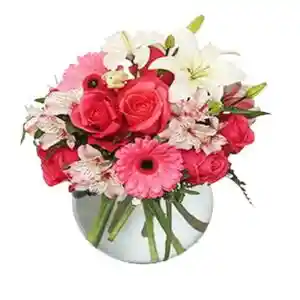 Pecera de Rosas Margaritas Astromelias y Lilium