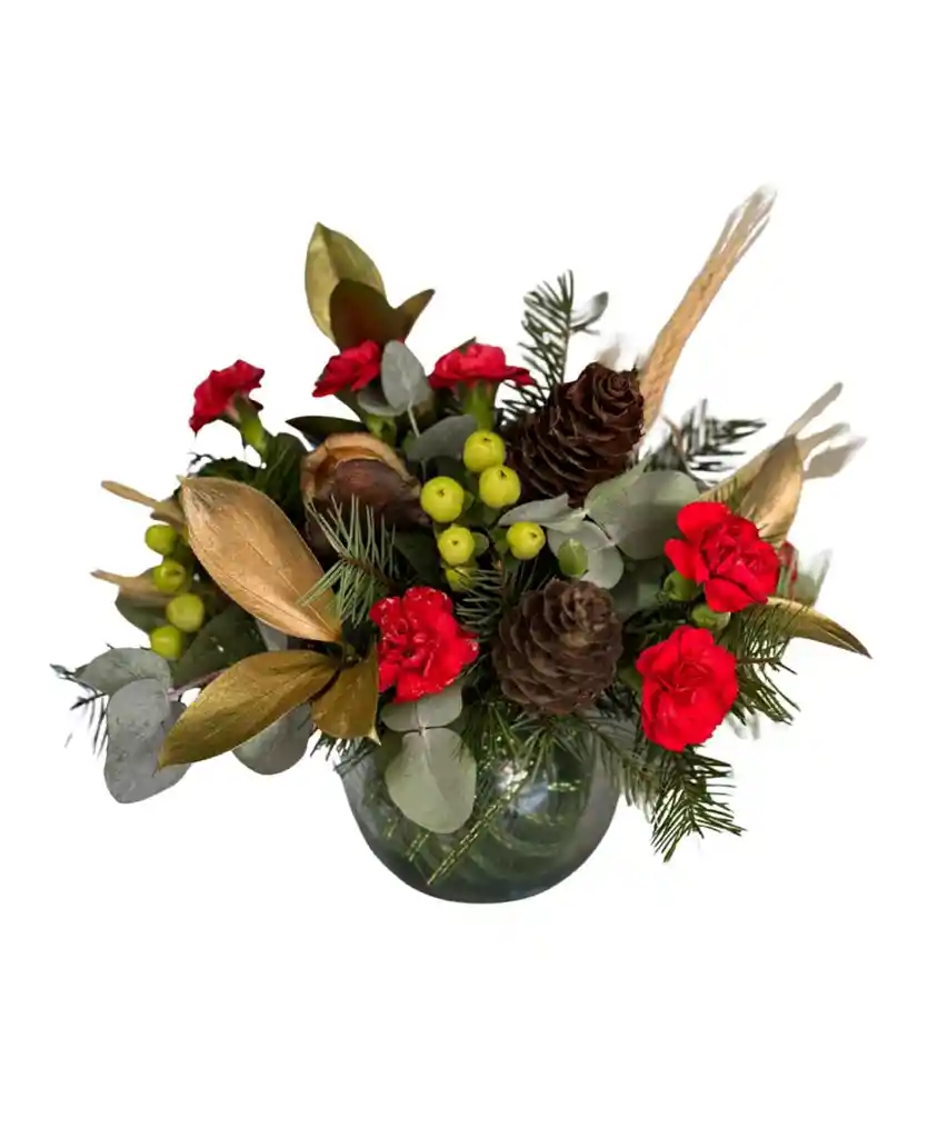 arreglo navideño con flores rojas, verdes, toques dorados y piñitas navideñas, en base de Pecera de vidrio pe...Ver más
