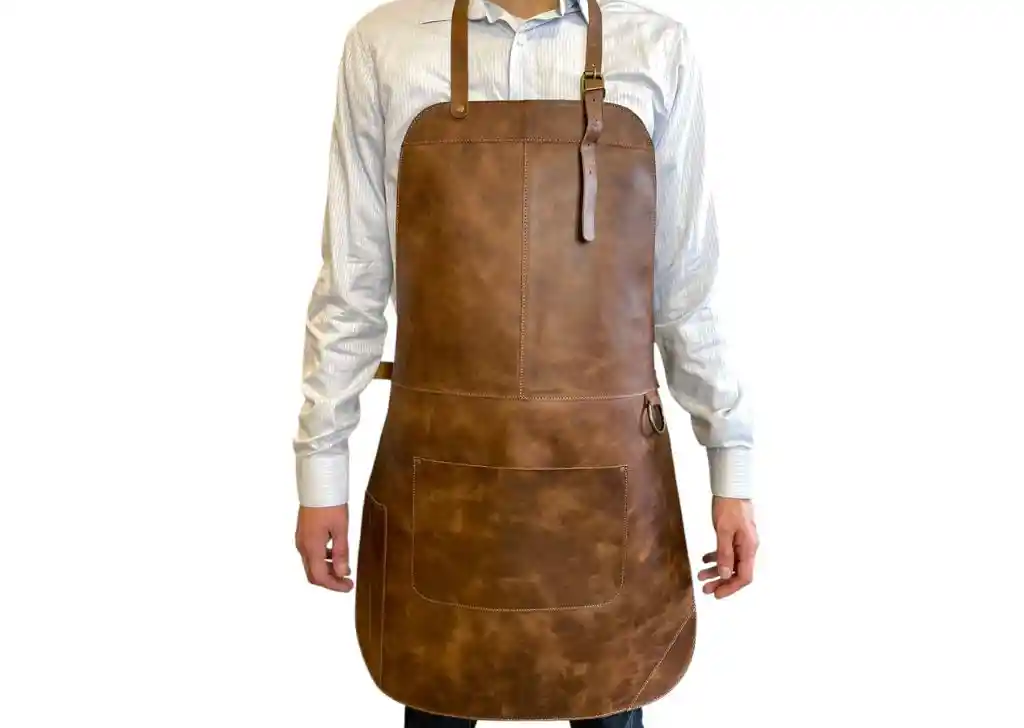 Funcional y resistente, nuestra pechera de cuero 100% genuino combina estilo y practicidad. Cuenta con un bolsillo mandíl frontal, un bolsillo lateral para cuchillos o pinzas y una argolla metálica para colgar paños. Las correas ajustables en cuello y costados aseguran un ajuste cómodo y personalizado. Ideal para cocina, parrilla o taller, es un accesorio duradero y pensado para acompañarte en cada detalle. Material: Cuero genuino Medidas: 72 x 51 cm Confección: Hecho en Chile