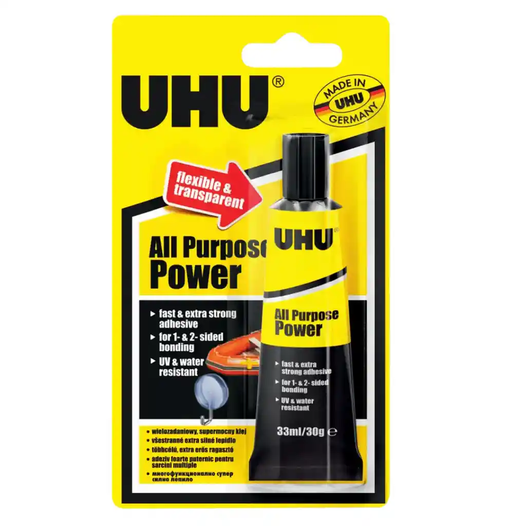 UHU All Purpose Power, el adhesivo universal transparente, rápido y potente con una fuerza de unión excepcional. Se puede utilizar para uniones por una sola cara (pegado en húmedo) o por ambas caras (pegado por contacto). Especialmente adecuado para juntas visibles y materiales transparentes. La película adhesiva permanece elástica, es resistente a los rayos UV y no se vuelve quebradiza. También se puede utilizar bajo el agua (p. ej. para láminas de PVC). Adhesivo universal transparente. Rápido, súper fuerte y elástico. Se puede aplicar a uno o ambos lados del objeto a pegar (pegado por contacto). Resistente a los rayos UV y al agua.
