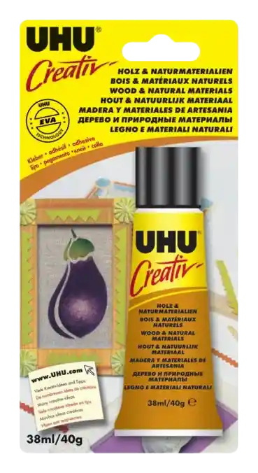 UHU Creativ Wood Natural Materials es un adhesivo fuerte y rápido con una fórmula de acetato de etilvinilo de primera calidad. El adhesivo se seca transparente y no contiene disolventes. Ideal para hacer maquetas, marcos de fotos, placas de puertas, adornos con palos, collages, colgantes, figuras decorativas, marionetas, cometas, móviles, casas de muñecas, juguetes, estrellas de paja y mucho más. Fórmula adhesiva de primera calidad Se seca transparente Sin disolventes Adhesión rápida y fuerte
