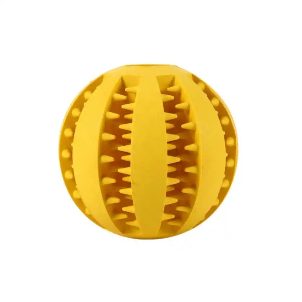 Este juguete puede despertar la curiosidad y diversión en las mascotas. . Material no tóxico e inofensivo para mascotas. Los perros pueden masticarlo para limpiar sus dientes. . Pueden ayudar para hacer algo de ejercicio para aliviar el mal humor y liberar la presión. . En los espacios entre la pelota puedes colocar algunos aperitivos alimentos o snack favoritos de tu mascota y el perro se sentirá atraído. Especificaciones: . Material: Goma. . Dimensión: 7 cm de diámetro. . Colores: Amarillo . Contenido: 1 Pelota Interactiva.