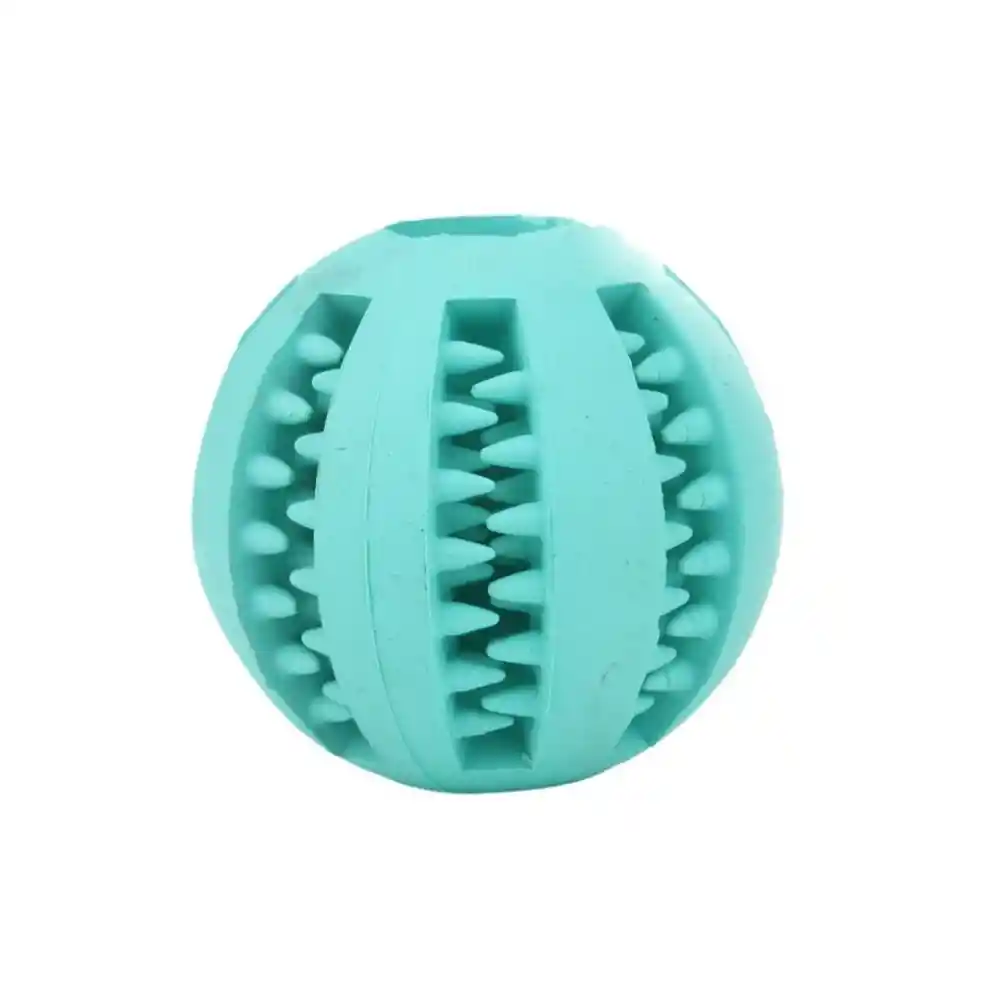 Este juguete puede despertar la curiosidad y diversión en las mascotas. . Material no tóxico e inofensivo para mascotas. Los perros pueden masticarlo para limpiar sus dientes. . Pueden ayudar para hacer algo de ejercicio para aliviar el mal humor y liberar la presión. . En los espacios entre la pelota puedes colocar algunos aperitivos alimentos o snack favoritos de tu mascota y el perro se sentirá atraído. Especificaciones: . Material: Goma. . Dimensión: 7 cm de diámetro. . Colores: Turquesa . Contenido: 1 Pelota Interactiva.