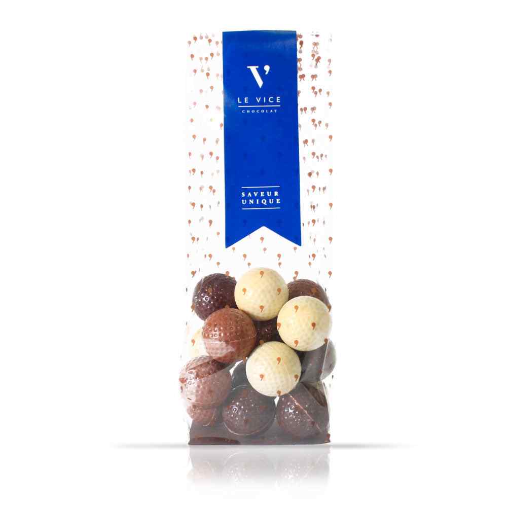 ¡El regalo perfecto para los golfistas! Nuestras figuras de chocolate en forma de pelotas de golf están rellenas en nuestro excepcional praliné de avellanas hecho en casa y bañadas en chocolate blanco, negro y de leche.