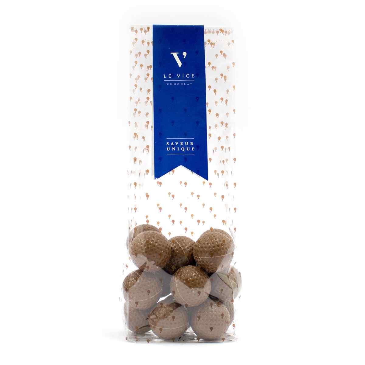 ¡El regalo perfecto para los golfistas! Nuestras figuras de chocolate en forma de pelotas de golf están rellenas en nuestro excepcional praliné de avellanas hecho en casa y bañadas en un delicioso chocolate negro.