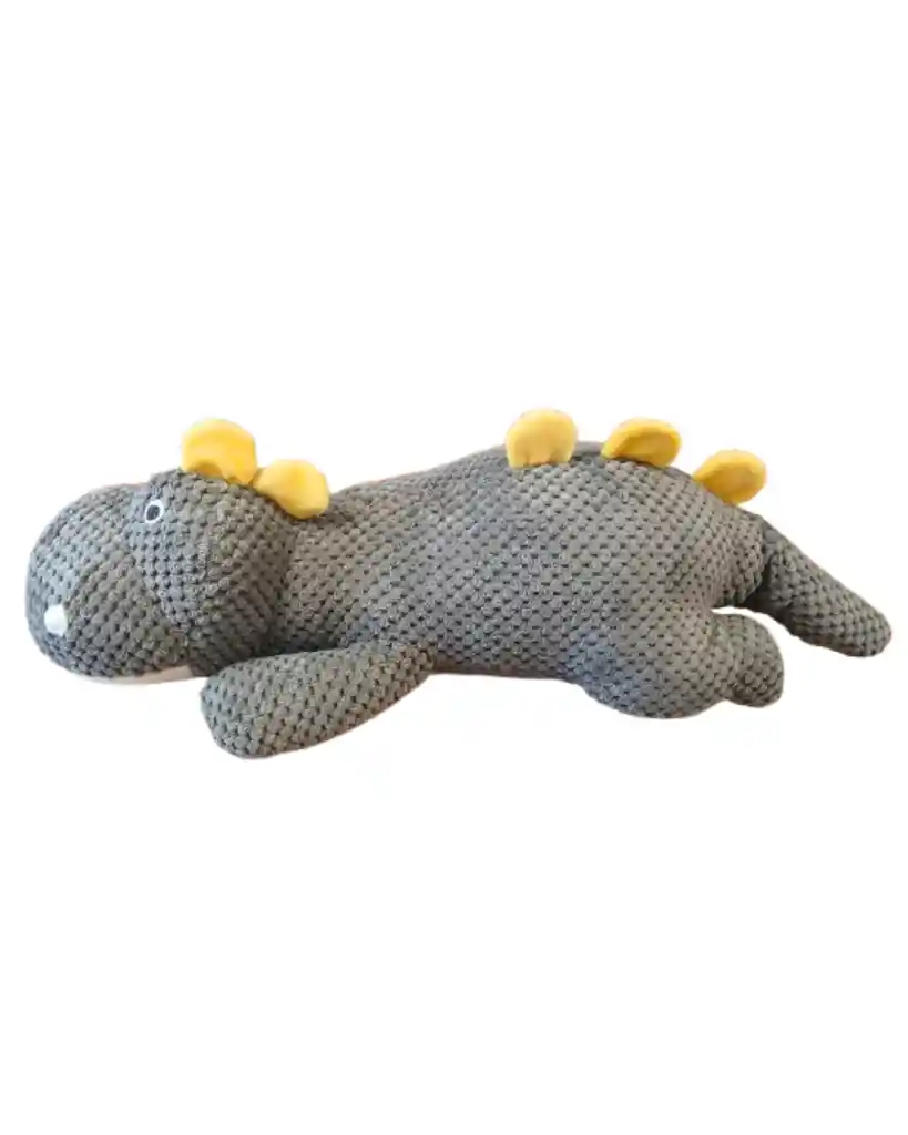 Este dinosaurio, es un juguete de peluche tejido (estilo amigurumi), diseñado frecuentemente como un juguete de apego para mascotas, debido a su textura suave y resistente. Su postura horizontal y alargada lo asemeja a un diplodocus o estegosaurio "dormilón". Material: Confeccionado con tela de pana suave de alta resistencia, diseñada para ser duradera y ayudar en la limpieza dental si se usa como juguete para perros. Funcionalidad: Estos peluches incluyen un chirriador (squeaker) interno para estimular el juego en mascotas. Dimensiones: Largo 50 cm; Ancho 20 cm