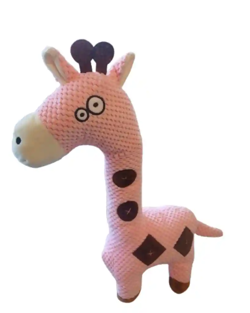 Esta encantadora jirafa rosa es un juguete de peluche tejido (estilo amigurumi), diseñado frecuentemente como un juguete de apego para mascotas, debido a su textura suave y resistente. Diseño: Peluche de textura suave con detalles bordados como los ojos y manchas oscuras. Dimensiones: Alto 55 cm; Ancho 40 cm