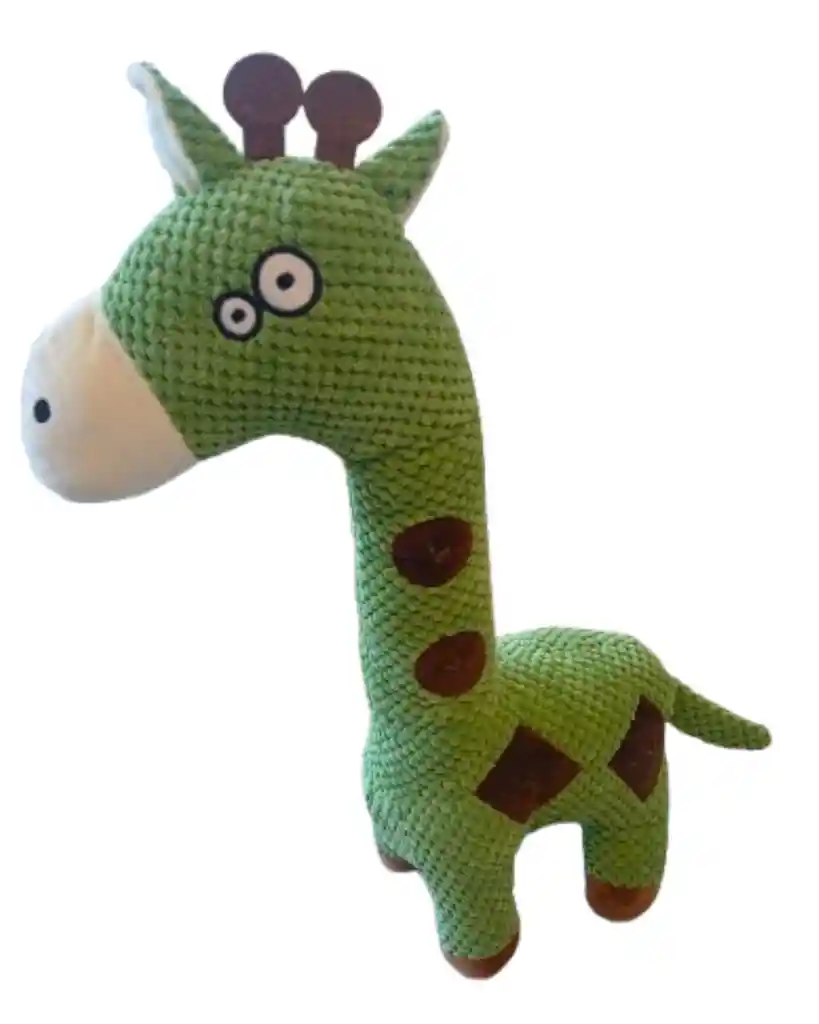 Esta encantadora jirafa verde, es un juguete de peluche tejido (estilo amigurumi), diseñado frecuentemente como un juguete de apego para mascotas, debido a su textura suave y resistente. Diseño: Peluche de textura suave con detalles bordados como los ojos y manchas oscuras. Dimensiones: Alto 55 cm; Ancho 40 cm