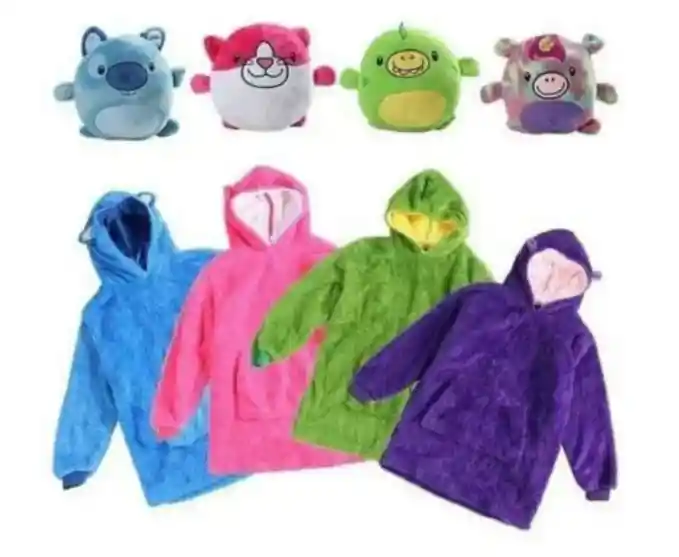 SOMOS MIKIIMPORTS ¡Tus hijos se mantendrán cálidos y cómodos de la manera divertida con la sudadera, es la nueva mascota que también es una sudadera súper cálida y suave. Se almacena como una mascota, pero se abre a una sudadera de gran tamaño ultrasuave y súper cálida. La mascota se pliega mágicamente en la capucha y se cierra con seguridad en su interior. Perfecto para cuando tus hijos están jugando fuera o paseando por la casa . ¡Variedad de diferentes amigos para elegir y cada uno con su propia personalidad única! ¡Colecciónalos todos! Tiernos y hermosos peluches, que se transforman en suaves y abrigaditos polerones con capucha. ¡Los niños se mantendrán cálidos y cómodos de la forma más divertida con los polerones! Perfecto para cuando los niños están jugando en el patio, salen de paseo y también para abrigarse dentro de casa. ¡Cuando salen de paseo llevan su peluche regalón y si les da frío solo deben abrirlo y ponérselo! ¡¡¡¡Maravilloso!!!!