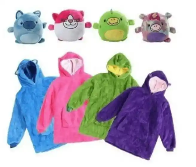SOMOS MIKIIMPORTS ¡Tus hijos se mantendrán cálidos y cómodos de la manera divertida con la sudadera, es la nueva mascota que también es una sudadera súper cálida y suave. Se almacena como una mascota, pero se abre a una sudadera de gran tamaño ultrasuave y súper cálida. La mascota se pliega mágicamente en la capucha y se cierra con seguridad en su interior. Perfecto para cuando tus hijos están jugando fuera o paseando por la casa . ¡Variedad de diferentes amigos para elegir y cada uno con su propia personalidad única! ¡Colecciónalos todos! Tiernos y hermosos peluches, que se transforman en suaves y abrigaditos polerones con capucha. ¡Los niños se mantendrán cálidos y cómodos de la forma más divertida con los polerones! Perfecto para cuando los niños están jugando en el patio, salen de paseo y también para abrigarse dentro de casa. ¡Cuando salen de paseo llevan su peluche regalón y si les da frío solo deben abrirlo y ponérselo! ¡¡¡¡Maravilloso!!!!