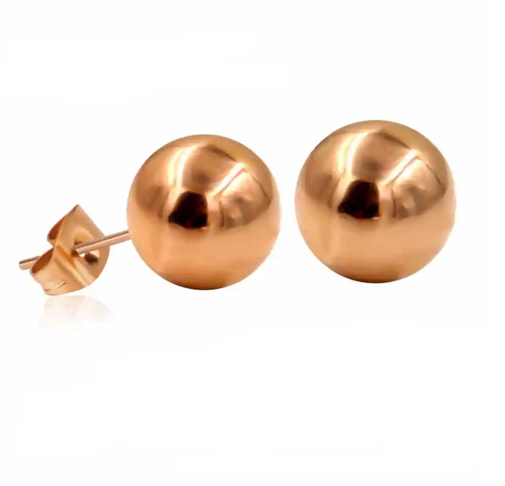 Hermosos pendientes hipoalergenicos, ideales para pieles sensibles, clásicos de esfera bañados en oro rosa 14kl. Metal: Acero Quirúrgico con baño de oro 14k Diámetros disponibles: 3mm, 4mm, 5mm, 6mm, 7mm y 8 mm. Esta publicación corresponde a la de 4mm. Peso aproximado: 1 g (Se envía con bella caja de regalo)