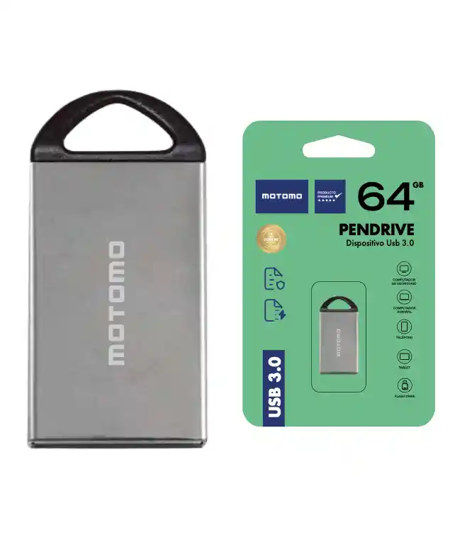 Pendrive Motomo 64 GB Este pendrive combina funcionalidad y diseño elegante, ideal para quienes buscan una solución confiable para almacenar y transportar datos. Con una capacidad de 16 GB, es perfecto para guardar documentos, fotos, música y videos. Su diseño compacto y resistente asegura durabilidad y portabilidad, mientras que su compati- bilidad con puertos USB 2.0 y 3.0 garantiza una transferencia de datos rápida y eficiente. Disponible en acabados modernos que se adaptan a cualquier estilo.