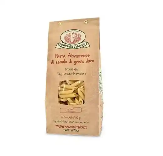 Pasta corta entubada clasica . Elaborada a la antigua para un corte desigual y artesanal. Con sémola de trigo duro, amasada con agua de montaña y moldeada en bronce para una particular aspereza, secadas lentamente entre 40 y 60 horas. Hecho en Italia.